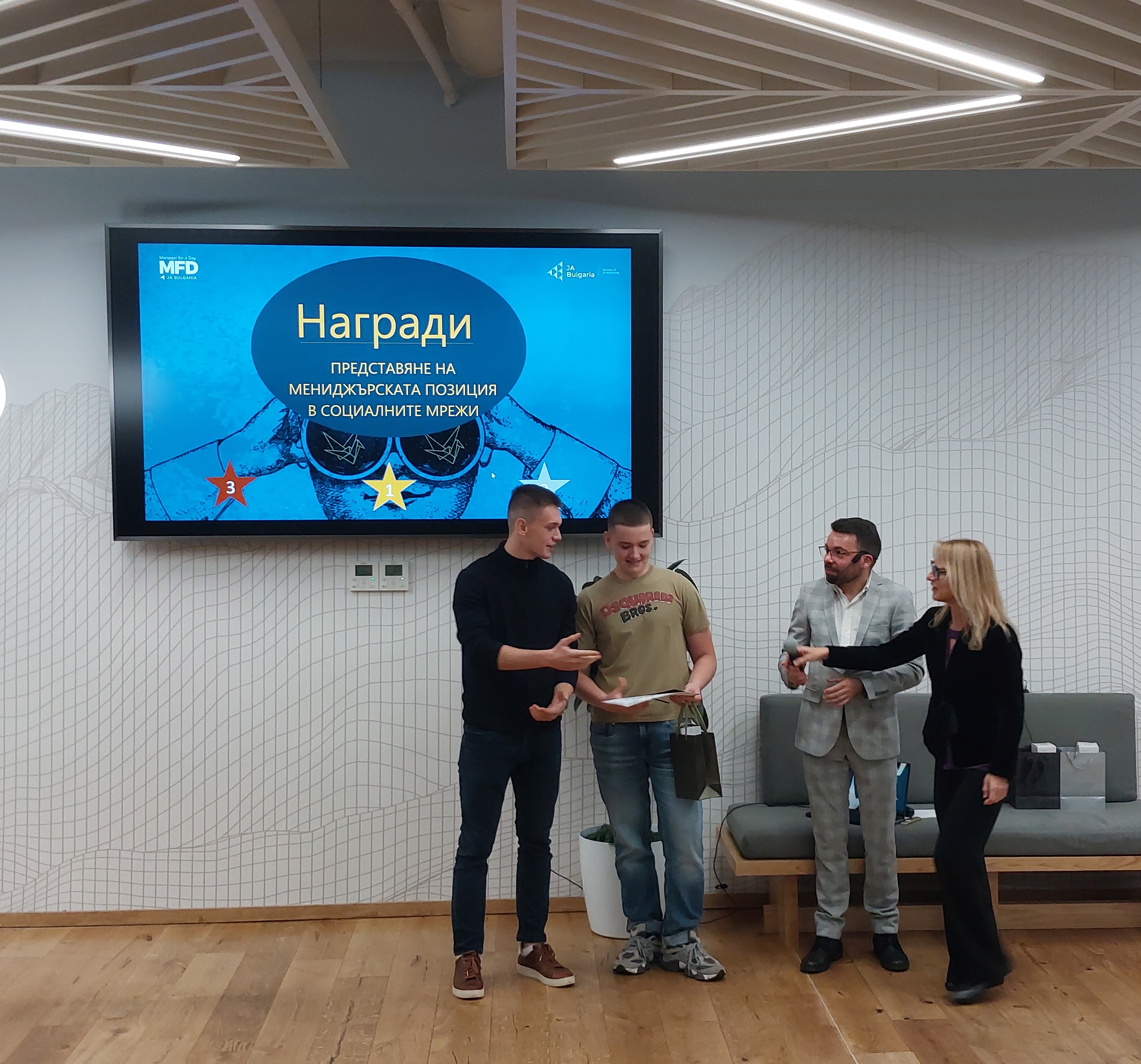 Друга голяма гордост бе връчването на Наградата за най-добро видео, посветено на мениджмънта. Отличието заслужено отиде при Димитър Хаджидимитров, Никола Попсавов и Денис Цонков от 11Н, които впечатлиха журито със своя артистичен почерк и оригинален поглед към предприемчивостта, управлението и подхода към човешките ресурси. Освен високата оценка, екипът спечели и парична награда от 1500 лева от организаторите.