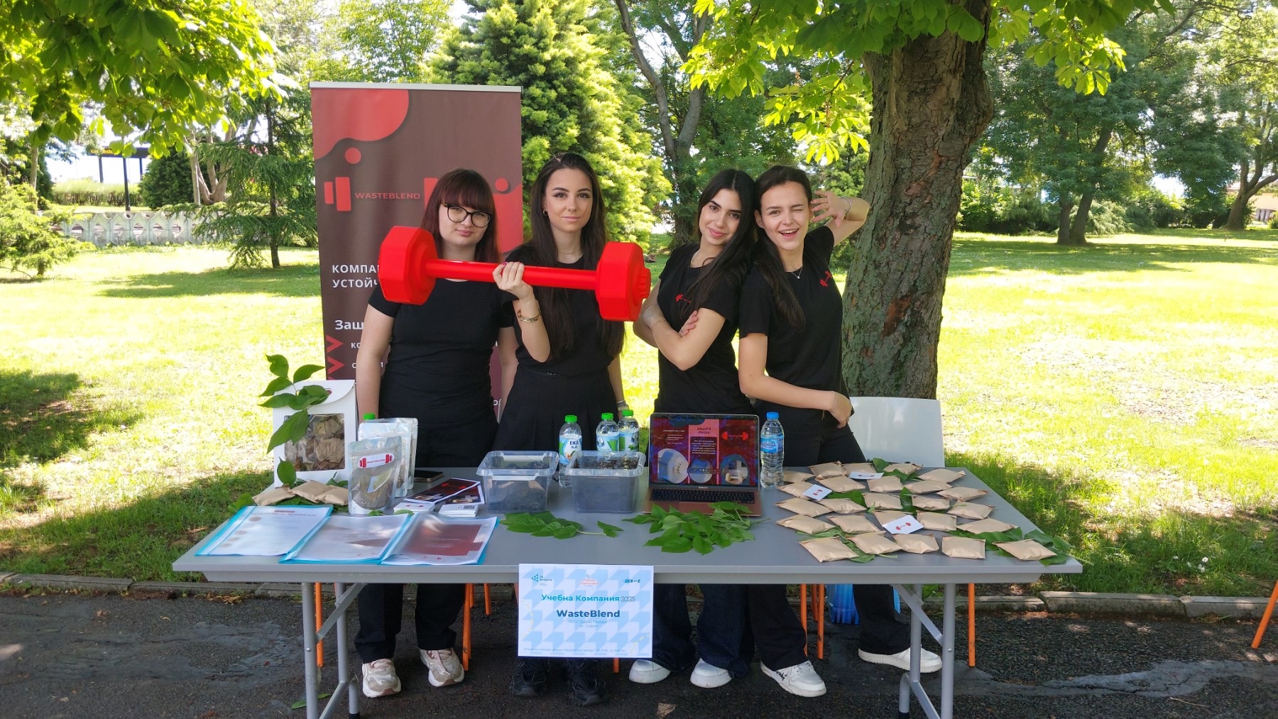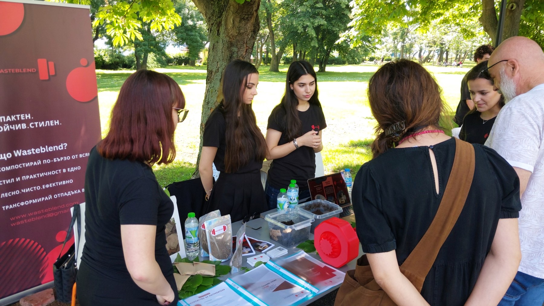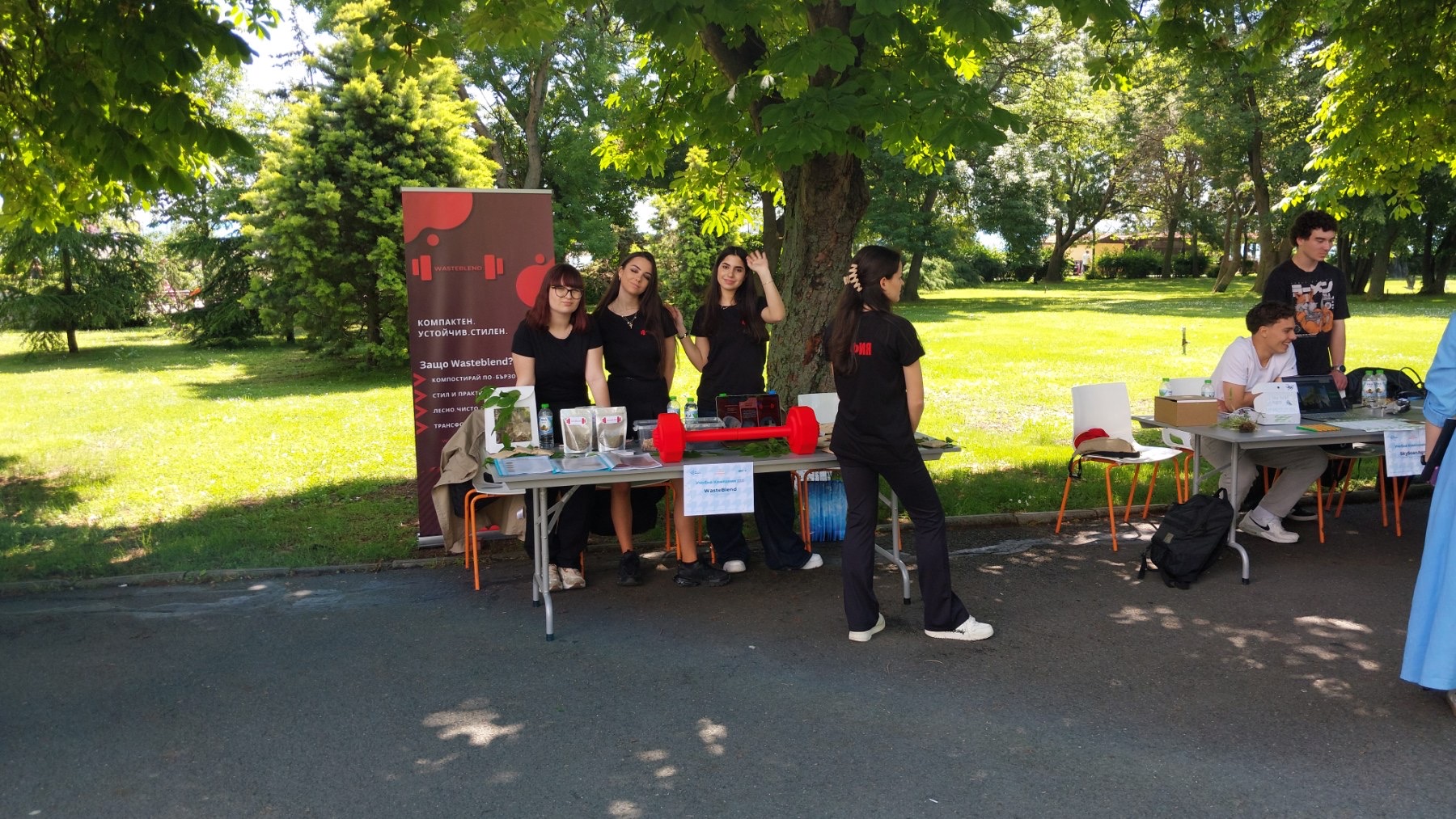 WASTEBLEND се яви с домашен компостер под формата на щанга и със специално разработен в сътрудничество с гл. ас. д-р Росен Иванов от катедра „Обогатяване и рециклиране на суровини“ в Минно-геоложкия университет - София активатор за ускорено производство на компост. Компостерът, чийто прототип бе разработен в сътрудничество с катедра „Инженерен дизайн“ с ръководител доц. д-р инж. Боряна Георгиева в Техническия университет - София е предназначен за спортисти и активни хора, които биха искали да водят устойчив начин на живот. Компанията от 11 Н клас е в състав: Ивайя Василева, президент, Адела Иванова, София Иванова и Кристина Дауод.