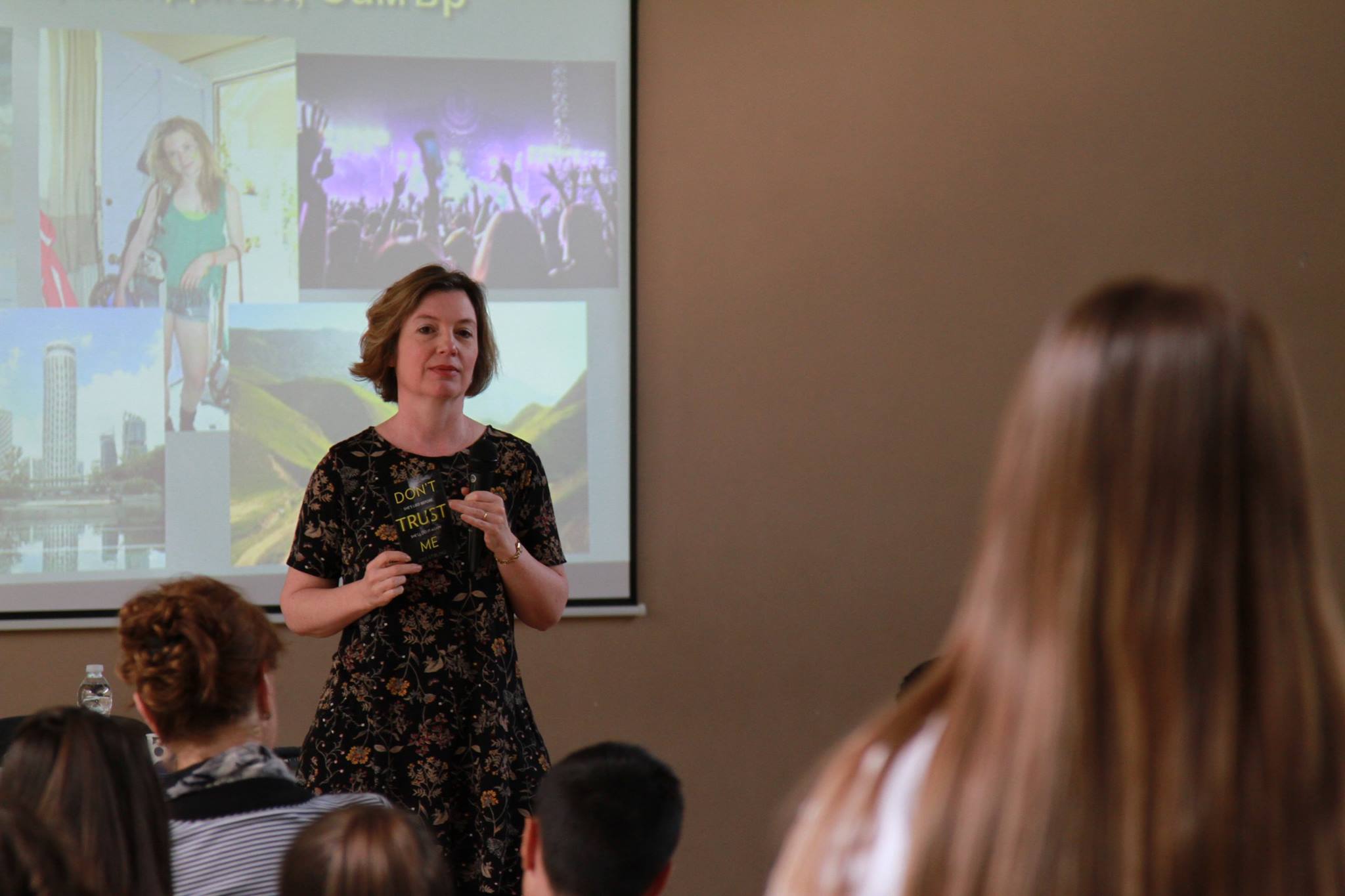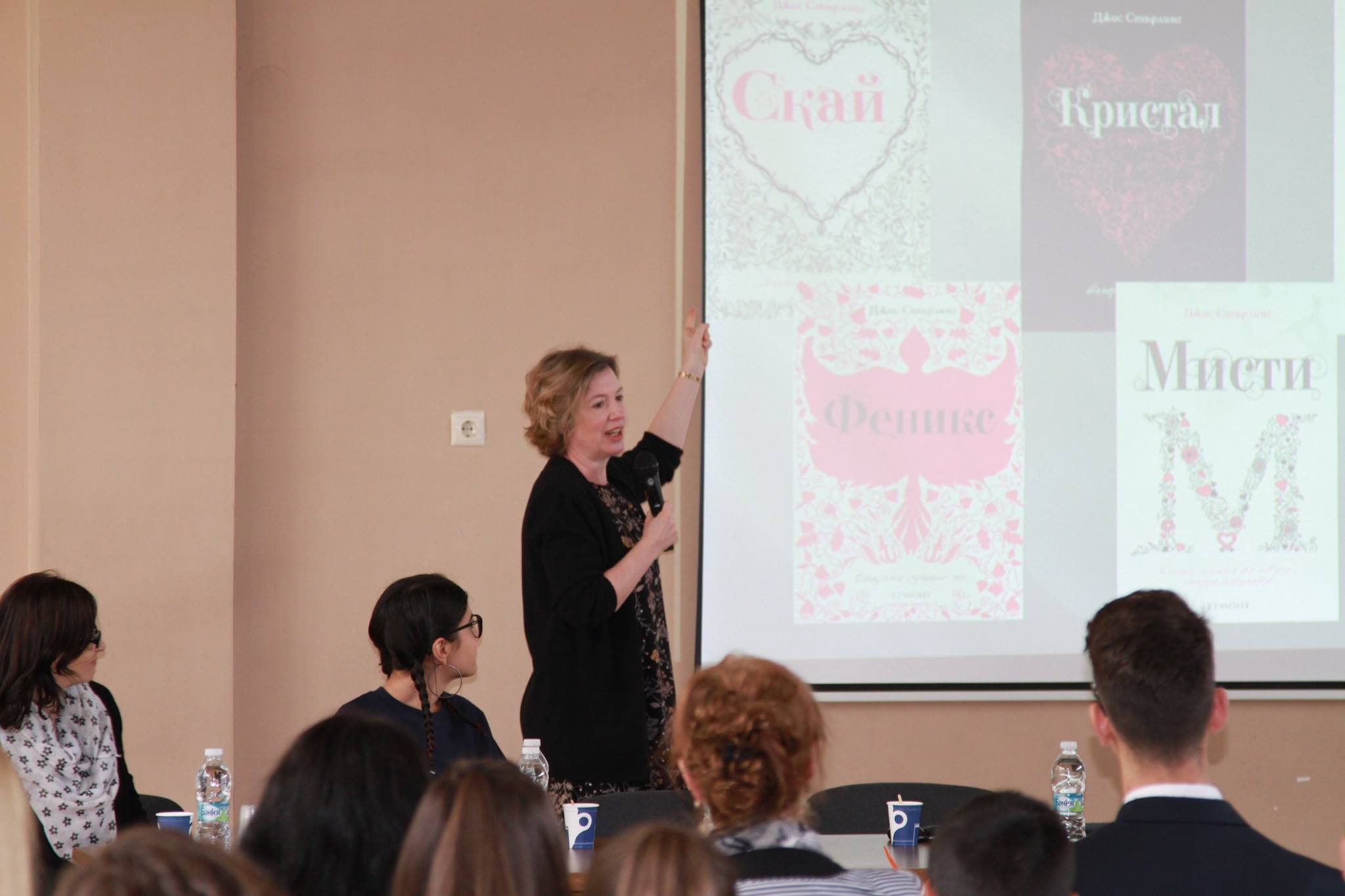 Среща на ученици от училищте „Дорис Тенеди“ с английската писателка Джулия Голдинг по известна с псевдонима си Джос Стърлинг.